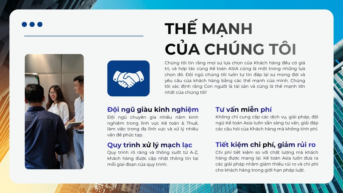 Năm 2020, Kế toán ASIA ra đời từ một mong muốn rất giản dị: Giúp doanh nghiệp yên tâm về kế toán, thuế và pháp lý để doanh nghiệp có thể làm điều mình giỏi nhất – đó là phát triển kinh doanh.